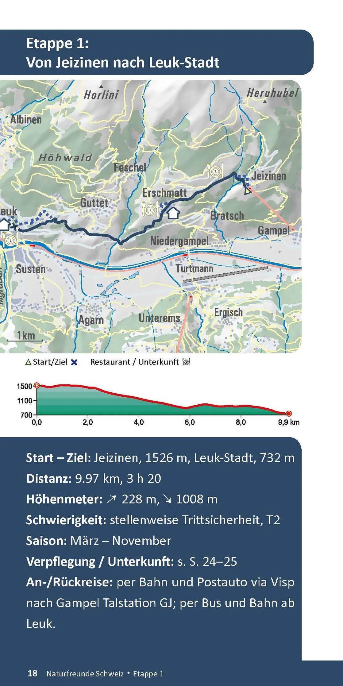 An-/Rückreise: per Bahn und Postauto via Visp nach Gampel Talstation GJ; per Bus und Bahn ab Leuk