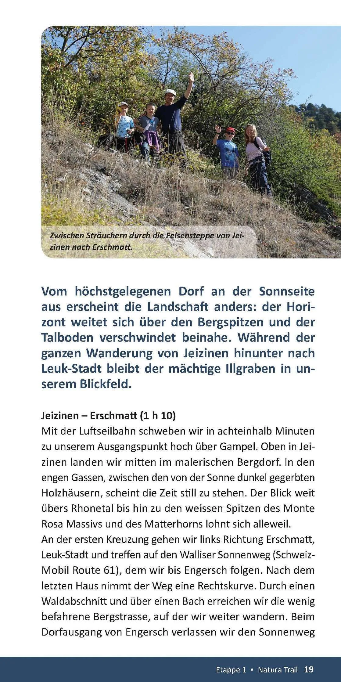 Von der Bergstation der Gondel Gampel – Jeizinen über die Sonnenterrasse nach Leuk-Stadt ist die Weitsicht übers Rhonetal einmalig. Die Wanderung durch die Rebberge bis nach Siders ist nicht nur für Weinliebhaber/innen ein Ausflug wert.